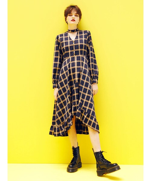 ※釦がハトメくるみに変更になります。首元がチョーカーライクでポイントになるワンピース。ジョーゼット素材で女性らしさもグッとあがります。裾はアシメフリルディティールで、ちらっと見える足元も綺麗に見せてくれます。首周りのアクセいらずで楽チンなワンピースで、ボーダーのカーディガンやブーツなど重めのアイテムでグランジミックススタイルが特におすすめです。