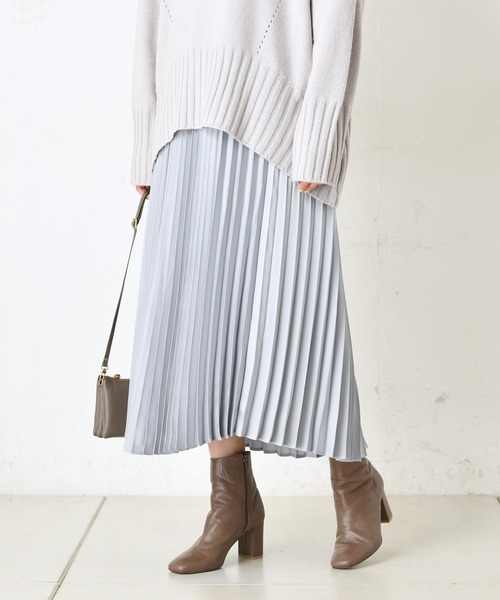上品に揺れ感を演出するプリーツスカート。サテンの光沢感が揺れるたび、大人の女性らしさを引き出してくれます。美シルエットなので、トップスも選びません。オーバーサイズから、細身のものまで幅広く合わせていただけます。ウエスト後ろがゴムなのも嬉しいポイント。キレイなカラー展開も魅力です。※サックスブルーはWEB限定カラーです。