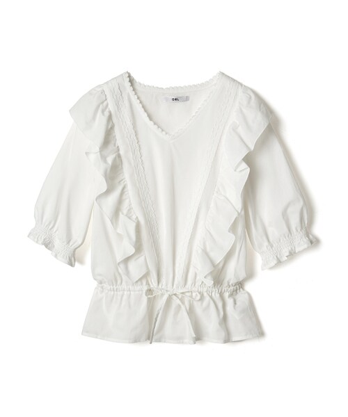 繊細なレースやフリル使いが女性らしさたっぷりのブラウス。 ウエストドロストリボンで可愛らしさもプラス。 Vネックがすっきりと大人顔に導くポイント。 キャンディースリーブがキュートな印象を与える。 ★レース部分は裁断の関係で、柄の出方が写真と多少異なる場合があります。