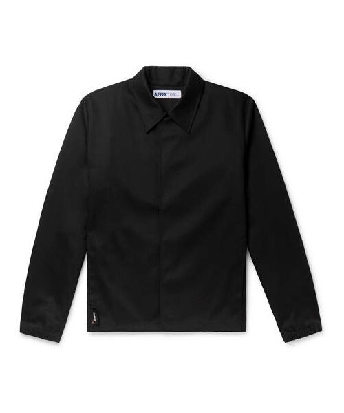 AFFIX 's AW19 collection is aptly titled 'New Utility', and features workwear-inspired pieces like this cotton-blend twill mechanic's jacket. It has sleekly covered snap fastenings and is printed with the brand's name across the back. Shown here with AFFIX T-shirt, AFFIX trousers, AMBUSH® bracelet, Salomon sneakers. This item is small to size; see Size & Fit notes. - - Black and white cotton-blend twill - Classic collar, two on-seam pockets, elasticated cuffs, two internal pockets - Snap fastenings - 65% polyester, 35% cotton - Dry clean - Imported