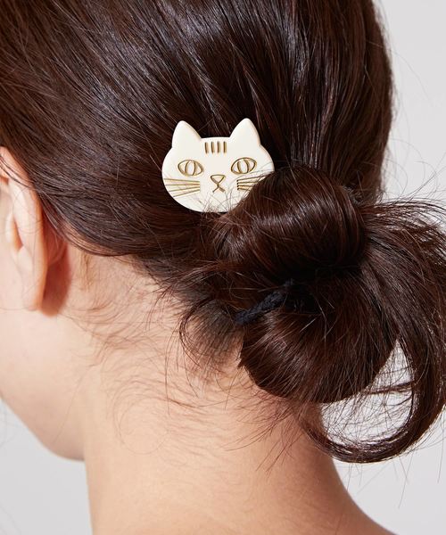 思わず目が合う、にゃんともお茶目で可愛らしい表情のねこモチーフ♪ポニーテールやハーフアップなど、髪を束ねたヘアゴムの結び目に差し込んで、お使いいただくヘアカフ。ヘアアレンジにアクセントをプラスしてくれる優秀アイテムです。ヘアゴムの上からお好きな位置に着けられますので、モチーフ付きのヘアゴムを着けるのが苦手な方も手軽に楽しめるヘアアクセサリー。猫好きな方へのちょっとしたプレゼントにもおすすめです。※こちらの商品は1点1点職人による手作りとなります。その為、形や色合い・模様など若干異なる場合がございます。あらかじめご了承ください。Amina Collection Co.,LTD.