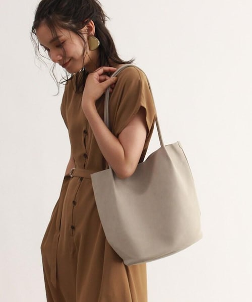 【デザイン】スエードのような起毛感を出したヌバック風フェイクレザーでおつくりしたバケツトートです。どんなコーデにも合うシンプルなデザインが使いやすいです。【機能性】軽量タイプです。ハンドルを長めにしているので肩がけにも対応します。底マチがあるので500mlのペットボトルも入ります。