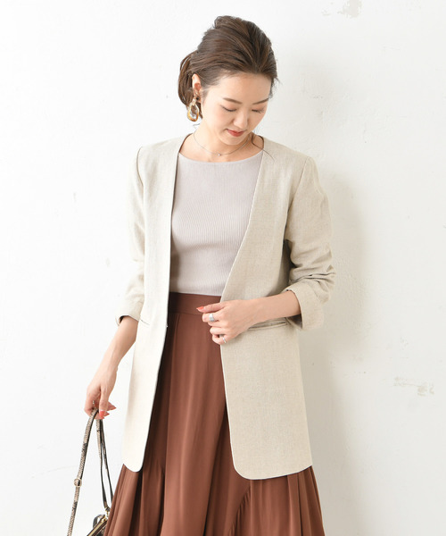 さらりとした着心地のリネン素材のノーカラージャケット。少し長めの着丈は体型をカバーしてくれるだけでなく、細長効果でスタイル良くすっきりとした着こなしを演出します。デコルテをきれいに見せる絶妙な襟ぐりのライン、少し高めの内ポケット位置など、計算し尽くされたデザインで、ワンランク上のおしゃれが楽しめる優秀アイテム。