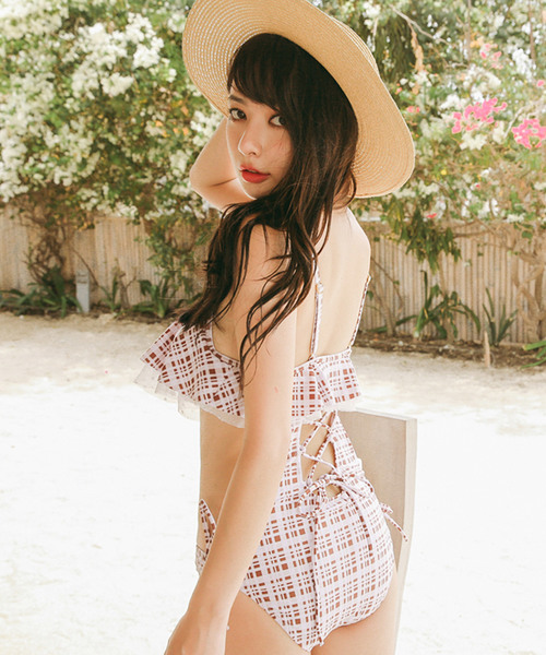 ─ Love Points! ─バックがモノキニデザインになった、オトナ可愛いワンピース水着です。サイズリボンと、編み上げがセクシーでスタイルアップ効果もみせてくれるデザイン◎歩くたびにふんわり揺れる、胸元の段フリルが小胸さんでも安心ですよ♪-------------------------------------------------◆パッド:レモンパッド付◆パッドポケット:あり◆アンダー調節:不可◆ワイヤー:あり-------------------------------------------------【モデル着用M】身長167cm 体重46kg【M】ブラカップ/ABCD アンダーバスト/31-44 ウエスト/32-44 ヒップ/34-47 【L】ブラカップ/CDE アンダーバスト/33-46 ウエスト/34-46 ヒップ/36-49 【XL】ブラカップ/DEF アンダーバスト/35-48 ウエスト/36-48 ヒップ/38-51※サイズは平置きで測定です。商品・着用者によって、多少の誤差が生じる場合がございます。※伸び縮みの有る伸縮素材の製品ですので、着用可能な適合許容範囲が比較的広い特徴があります。※柄生地は総柄の為、1点1点柄の配置が異なります。予めご了承下さい。※表示のカップ数はあくまで基準となり、デザインやパッド使い・着方などで異なるサイズでも着用可能です。【お取扱方法】※乾燥機、洗濯機のご使用はお避け下さい。★ご注意事項★★ご使用後、海水やプールの塩素を落とす為、早めの水洗いをおすすめします。★ご使用後、ビニール袋に密閉し長時間放置しますと塩素等の影響で変色する可能性がございます。★手洗い後はバスタオルなどで押して水分を取り、直射日光は避け、陰干しをお願い致します、乾燥機やドライヤーは厳禁です。★プールのスベリ台での摩擦は、生地を傷めます。★パットについて★折れ曲がっていたりパットが凹んでいたりする場合がございます。その場合、スチームアイロンのスチームでパットの凹みが取れることもございますがアイロンは直接当てず、スチームのみを当てて下さい。