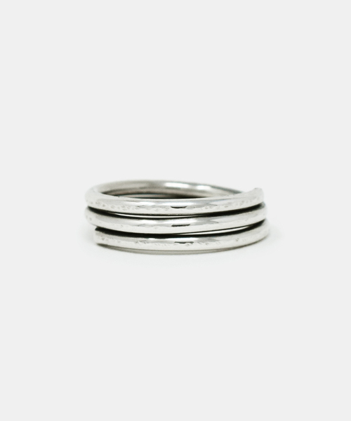 それぞれ2mmと2.5mmの銀線を使用して制作したリング。工具を使って1点1点細かなキズや凹凸をつけています。 仕上げは、鈍く光るような雰囲気の加工を施しているため立体感があり、肌馴染みも良くデザインされています。こちらの商品にはUNKNOWN.オリジナルケースが付きます。自分へのご褒美や、大切な人へのギフトとしてもおすすめのアイテムです。- UNKNOWN./アンノウン「SILVER、GOLD」といった無機質な物を使用しながらもその素材の良さを最大限に生かすため、”モチーフ”や”柄”などのデザインを一切取り入れない、シンプルに特化したジュエリーブランドです。シンプルなデザインを機械で制作するのではなく、あえて原型から仕上げまで、デザイナー自身が手作業で行っています。そのため、直線や曲線でも1つ1つ異なり、単純なデザインにこそ必要とされる「微妙なバランス」のとれた暖かみのあるジュエリーを創造しています。