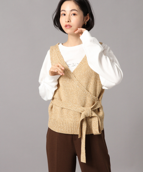 表面感のあるデザインニット 表面感のある糸を使用して編みこんだニットビスチェ。 今年らしいカシュクールに着こなせるデザイン性のあるアイテムです。 前後ろ2WAY仕様にしているので、その日の気分に合わせてきこなしていただけます。インナーにはお持ちのノーカラーのシャツやワンピース、Tシャツの上に合わせ ストレートのパンツやデニムと合わせたスタイルがおすすめです!!