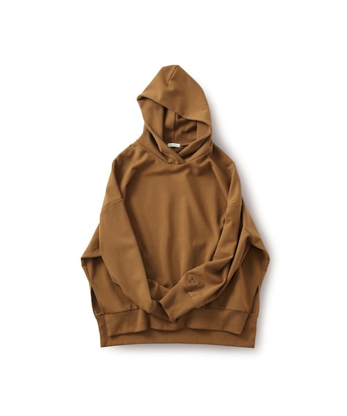 癖がすごいパーカー。さらりとした着心地が気持ちいいストレッチポンチで作ったパーカー。しっかりと肩を落としたドロップショルダーや、長めのリブを通りこしさらに深く入れたサイドスリット、前後差をつけたヘムラインなどふつうのパーカーにはならないようひと癖もふた癖もつけました。モデル身長165cm