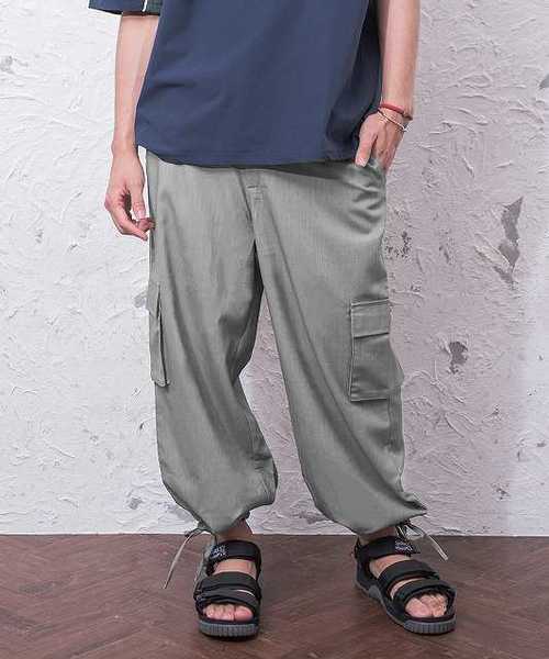 【カーゴポケットワイドパンツ】●理想のルーズ感裾絞りワイドパンツコーディネートに絶妙なゆるさをプラスする、カーゴワイドパンツの登場!普段のデザインはワイドパンツですが、裾にドローコードを通しており、絞ることでバルーンパンツとしてもお楽しみいただけるアクセントに効いたデザインに。ウエストには調節紐、バックにはゴムを通しており、穿きやすさにも拘った一本。●テロンとくせになる、滑らか夏素材動きに合わせてなびく滑らかなスーツ生地で仕立てました。薄手の生地感で夏の暑い季節にピッタリ。カラーリングも落ち着きのある大人な印象のラインナップに。■生地の伸縮性 ・・・ ウエストゴム部分のみ伸縮します■生地の透け感 ・・・ 部分的・淡色はやや透け感があります■生地の厚み ・・・ やや薄いです■裏地の有無 ・・・ 無し=============================【お買い物をもっと便利に楽しく♪】■商品のお気に入り登録をすると・・・完売カラー・サイズの再入荷通知や、ラスト1点の通知、お得なセール情報も受け取ることができます!■ブランドのお気に入り登録をすると・・・新商品や再入荷のお知らせなどいち早くブランドの最新情報を受け取ることができますのでご登録をオススメします!