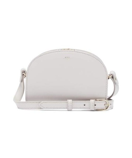 A.P.C. - A.P.C.'s cult-favourite half-moon silhouette arrives in a refreshed interpretation courtesy of this lilac-tinged grey bag. Constructed from smooth leather to a cross-body form, the structured design swings from an adjustable strap – hot-stamped with metallic gold logo lettering at the front – and opens to a beige twill lining. Spotlight the feminine shade over muted palettes.