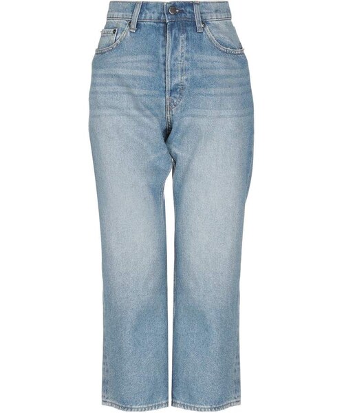 CHEAP MONDAY Jeans. logo, denim, worn effect, shaded effect, solid color, medium wash, mid rise, front closure, button closing, multipockets, straight-leg pants, small sized. 100% Cotton