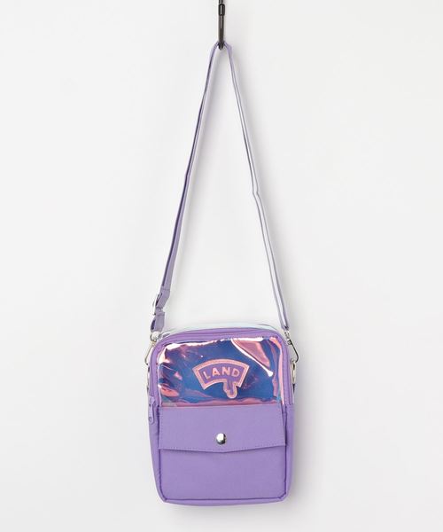 2019 Autumn Collection虹色に輝く"ホログラフィックPVC"を使用したポーチバッグシリコンラバー製のLANDドリップロゴがフロントに配置。メイン収納のほか、背面にジップポケット、フロントにはスナップボタンで開くフラップポケットがあります。財布やスマホ・手帳などちょっとしたものを持ち運ぶのに便利なサイズ感です♪A,パープルB,ブラック