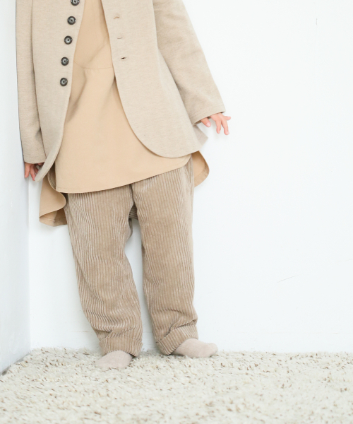 季節感あるコーデュロイパンツ 軽い素材を使用したコーデュロイのサルエルシルエットパンツ。 ヒップ周りはゆったりで、裾に向かって細くなっているのでオーバーサイズのトップスと合わせて着用してもバランス良く着て頂けます。 お揃いのノーカラーコートあるのでセットアップでも着て頂けます。 男の子でも女の子でも着て頂けるデザインになっています♪