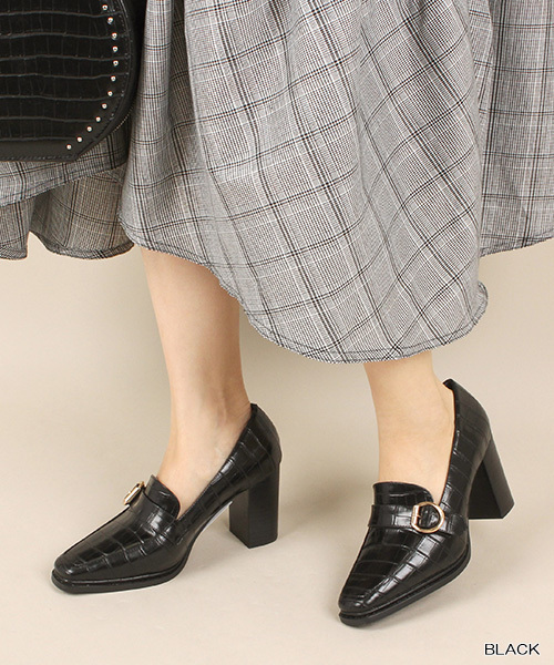 ◆2019AW新商品◆ スクエアトゥのデザインにゴールドバックルが目を惹くヒールアップシューズ。 少し厚みをもたせたストームと存在感のある太ヒールで美脚効果が期待できます。 ブラックとダークブラウンのベーシックカラーにクロコの型押し素材を使用し、 シンプルながらも存在感のある一足に仕上げました。 ‐‐‐‐‐‐‐‐‐‐‐‐‐‐‐‐‐‐‐‐‐‐‐‐‐‐‐‐‐‐‐‐ ★スタッフコメント (足の形には個人差がございますのであくまでご参考までにお願い致します。) 【スタッフA】 普段23.5を着用。足幅3E(広め) 幅は少しきついですが、Mサイズを履きます。 【スタッフB】 普段23.5を着用。足幅E(ふつう) 私はMサイズを履きます。 【スタッフC】 普段24を着用。足幅D(ふつう) 私はLサイズをゆったり履きます。 ‐‐‐‐‐‐‐‐‐‐‐‐‐‐‐‐‐‐‐‐‐‐‐‐‐‐‐‐‐‐‐‐