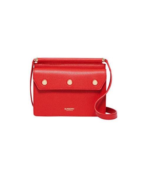 Burberry leather shoulder bag with golden hardware. Adjustable strap secured by bar top, 18.5"-20.9" drop. Double flap at front and back; magnetic closures. 5.9"H x 7.5"W x 2"D. Made in Italy.