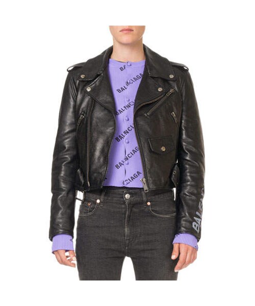 Balenciaga jacket in bull leather. Notched lapel; asymmetric zip front. Long sleeves; logo print detail. Three front-zip pockets. Hip snap pocket. Epaulets. Classic fit. Belted hem. Cropped above hips. Made in Italy.