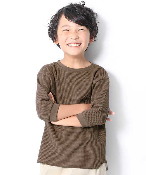 表面の凹凸が表情豊かな『ワッフル7分袖Tシャツ』肩のラインが落ちたドルマンスリーブで絶妙なゆるっとシルエットに仕上げました。裾はラウンドデザインなので1枚でもおしゃれに着こなせます。キッズからジュニアまでをカバーする100cm~160cmまでの豊富なサイズ展開になっています。■素材■心地よい肌触り、上質素材の綿100%肌触り・通気性の良いさらっとした着心地で汗の吸収・発散性に優れており型崩れしにくいのもポイント。■ディティール■伸縮性:あり・便利なお名前タグ付き・着丈はうしろ長めのおしゃれなデザイン