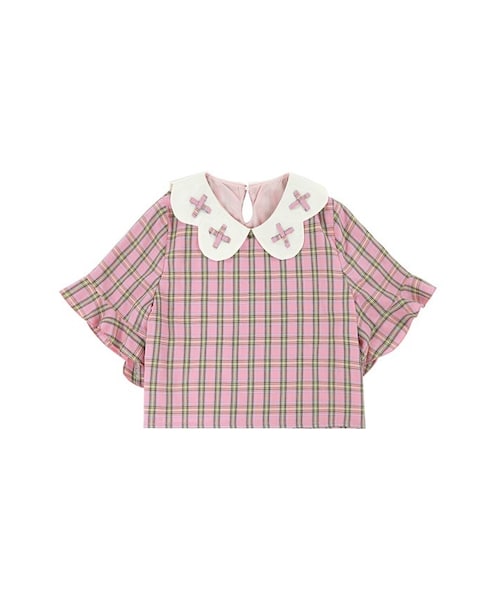 ♡2019SS New Collection♡ 特徴あるフラワーカット襟にチェック柄のバッテン ミニ丈も含めてコミカルな一面があって新鮮 ベルスリーブにフリルをプラスボリュームUP 身頃はゆったりサイズ感のためボトムスはタイトめに 夏の甘ガーリーStyleでバランスよくまとまるよ 秋口にぴったりなカラーもご用意あるよ 「ピンク」「パープル」「ブラウン」の3色展開