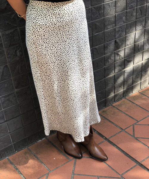 ドットのようなダルメシアン柄のスカート。 セミフレアでスッキリと見えるシルエットで仕上げています。 夏はカットソーで合わせ、秋になるとニットと着ても相性が良くお勧め。 アニマル柄の為秋らしさも出る一枚です。