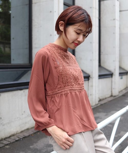 flowerらしさ溢れるレース切り替えデザインブラウス♪ 胸元の花柄レースで華やかなスタイルにきまる優秀な一枚。 繊細で可愛いレースの組み合わせが他にないアイテムです。 ナチュラルなモチーフのflower laceが甘すぎず、凛とした大人可愛い雰囲気を作ります。 胸元は透けるレースを使用しておりますので、デコラティブなデザインの中に女性らしさや抜け感も感じさせるデザインに仕上げております。 ウエストで切り替えを入れて、裾に向かってフレアなシルエットにすることで目線を上げられてスタイルアップして見える効果も◎ 胸元にポイントをいれたデザインにしておりますので、一枚では勿論肌寒い季節にはニットカーディガンやアウターの中に着ていても華やかに見える、シーズンレスなアイテムです。。
