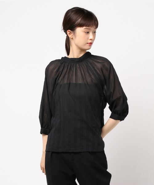 清涼感のあるコットンボイル素材で仕立てたプルオーバーブラウス。さりげなくストライプ柄が入った、ほんのり透け感のあるナチュラルな風合いが魅力です。プチハイネックは、バックでボウタイリボンを結ぶレディライクなデザイン。たっぷりのボリュームスリーブも今年らしい表情の1枚です。