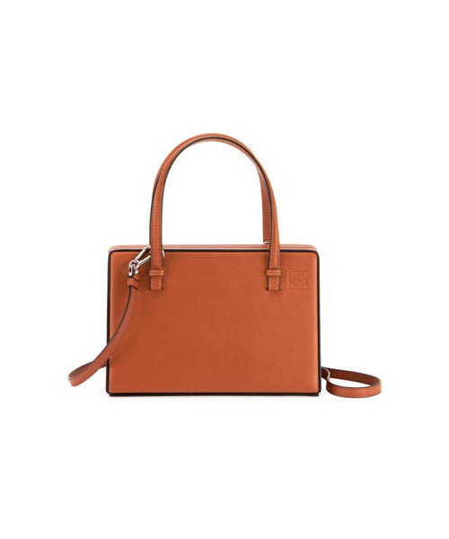 Loewe box bag in soft calf leather. Padded top handles. Removable shoulder strap. Framed body. 5.3"H x 6.7"W x 3.3"D. Made in Spain.