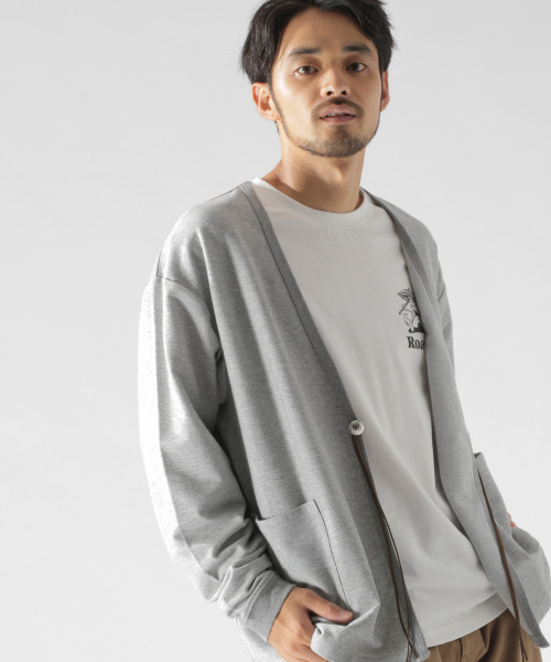 ツイル編みのカットソー素材を使用したトッパーカーディガン。綿PU素材のため伸縮性がありストレスなく着ていただけます。コンチョ釦がアクセントです。