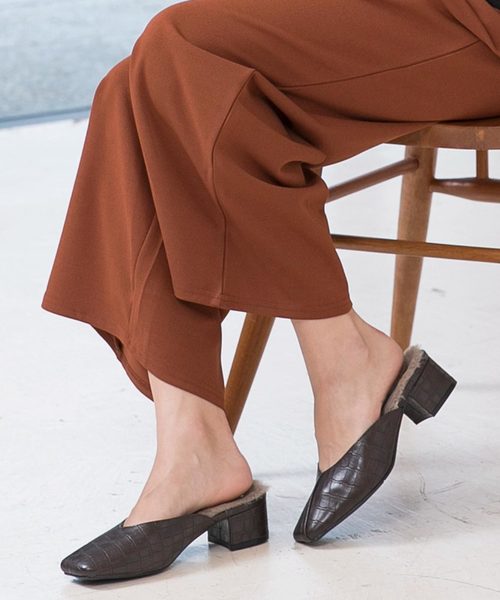 トレンドのスクエアトゥのミュール。中敷きにはファーを施して、足当たりも心地良い一足◎靴を脱いでもお洒落な印象に。晩夏~秋に履きたい大人っぽいシューズ。きれいめからカジュアルまで幅広いコーデにマッチします。【素材・サイズ感】S~LLの4サイズ展開。スムース・クロコ風生地で高見え。チャンキーヒールで安定感ある履き心地◎