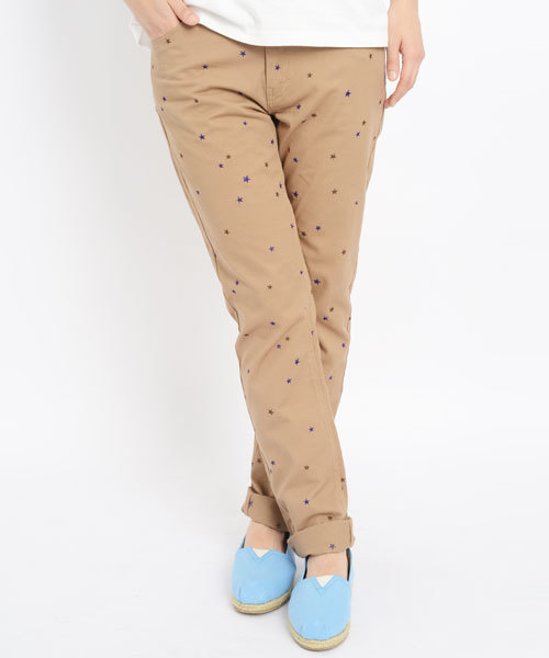 カラフルな星をちりばめた様な刺繍がポイント。細めのテーパードなので、すっきりとしたシルエットに。 ※画像の商品はサンプルです。 実際の商品と仕様、加工、サイズが若干異なる場合がございます。 model:身長164cm 着用サイズ:1