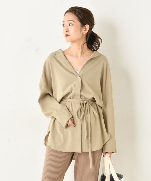 着こなしのアレンジが楽しめるベルト付き前開きシャツ。ドロップショルダーに丸みを帯びたゆったりシルエットがこなれた雰囲気を演出。腰高位置にリボンを結んで脚長効果のある着こなしや、ニットのインナーとしてレイヤードスタイルも楽しめます。幅広く着回せるので重宝する1枚。