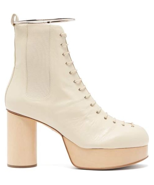 Jil Sander - These 1970s-imbued cream boots are seen in Jil Sander’s Pre-AW19 lookbook and have a detachable silver-tone metal ankle bracelet. They’re crafted in Italy from creased leather, accentuating the vintage mood, with a sculpted round toe and lace-up front, then sit on a wooden platform midsole and cylindrical heel. Wear them with a sweater and midi skirt to echo the label’s contemporary styling.