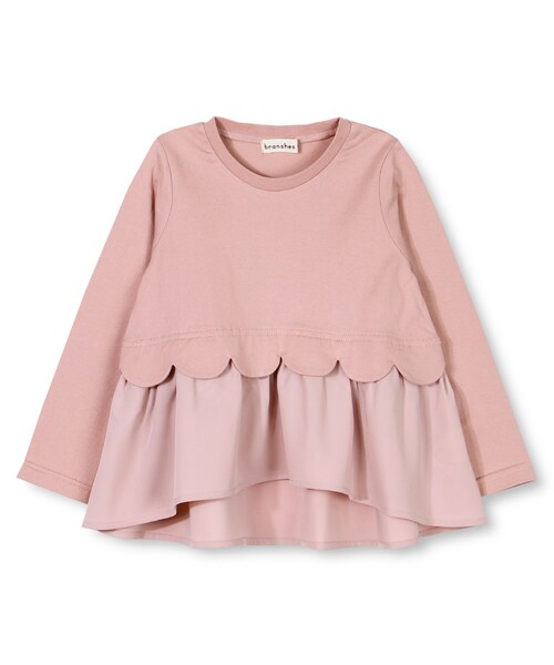 裾部分に異素材を使用したペプラムデザインがポイントとなった長袖Tシャツです。また切り替え部分のスカラップがアクセントとなっており、ギャザーを入れふんわりと仕上げています。 ※80cmから90cmは、首もとがスナップボタン仕様となります。