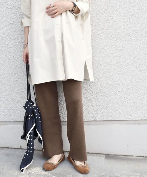 しっとりとしたなめらかな肌触りがポイントのニットパンツ。 フロントにダーツ、裾にスリットをいれるなど、ディテールにこだわった一着。 いつものワードローブに加えるだけで、様々なコーディネートに活躍してくれます! 同素材で、ニットワンピースも展開しています!セットでのコーディネートもおすすめです! ワンピース⇒314-54-0751 -------------------------------------------- 生地の厚み:普通 伸縮性:有 透け感:無 光沢感:無 -------------------------------------------- 【スタッフ着用コメント】 《スタッフ1》 身長:156cm/体型:細身/普段サイズ:S/着用サイズ:ONE SIZE サイズ感:ウエストはゆるめでした。丈はぎりぎり床につかない程度です。 コメント:肌触りもよく、すとんと落ちるシルエットがとてもきれいです。ビッグシャツや同素材のワンピースとの合わせがおすすめです! -------------------------------------------- ※摩擦により毛羽立ちや毛玉が生じやすい為、連続着用はお避け下さい。 ※末永く愛用頂く為に、アテンションタグを必ずご確認の上、着用又はお取り扱い下さい。 ※画像の商品はサンプルです。 実際の商品と仕様、加工、サイズが若干異なる場合がございます。 ※屋外での撮影画像は、光の当たり具合で色味が異なって見える場合があります。商品の色味は、スタジオでの詳細画像をご参照ください。