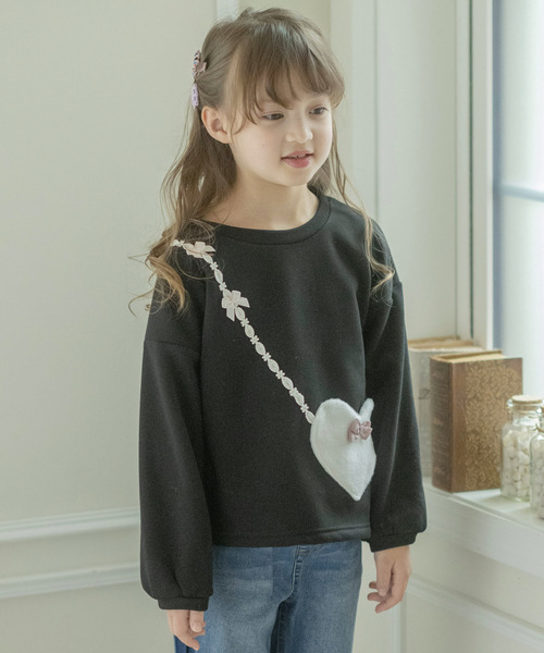 女の子全開、おしゃまコーデに ハートポシェットポッケのあったか長袖トップス ハート型ポシェットをつけているかのような キュートデザインの女の子トップス! 裏起毛のあったか仕様も 薄手トレーナーくらいの厚みだからもたつかず、 通園通学にもすっきり着られます。 コーデの主役になれるかわいい長袖トップスは パンツスタイルにもスカートにも合わせやすく、 いつもの着こなしだって瞬時にガーリーな印象に昇華。 女の子のデイリーカジュアルスタイルを もっとかわいく、もっともっとスウィートに! リラックス感のあるドロップショルダーで、袖口は絞って、ギャザーを寄せています。 ポシェットデザインの紐部分はレース、サテンリボンもあしらっています。 ポシェット部分はもこもこハートのポケット。グログランリボンもかわいいアクセント! 伸縮性:あり 生地の厚み:薄手トレーナーほどの厚み 透け感:なし ポケット:ハートモチーフ部分 裏地:なし ※モデル画像は実際の商品と色合いが異なります。 実際の色合いは商品単体画像をご覧下さい。 ※商品の素材や色合いなど、生産時期によって差異が生じます。