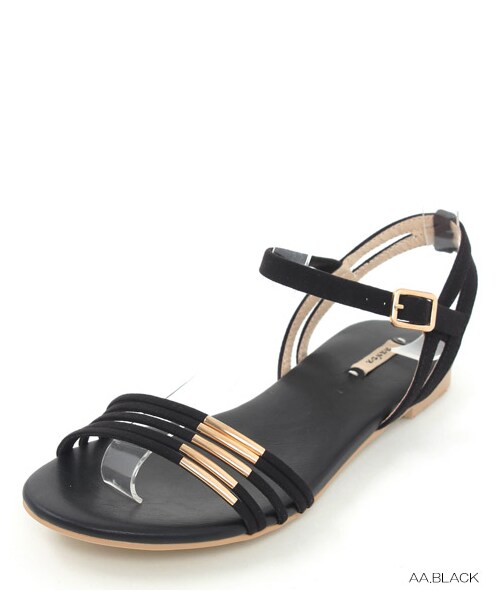 ゴールドのメタリックパーツがクールな印象のフラットサンダルです。ワンカラーでまとめたので、ポイントカラーは足元にアクセントをプラスできます。足首ストラップで固定されて歩きやすく、たくさん歩くお出かけにもピッタリです。140529