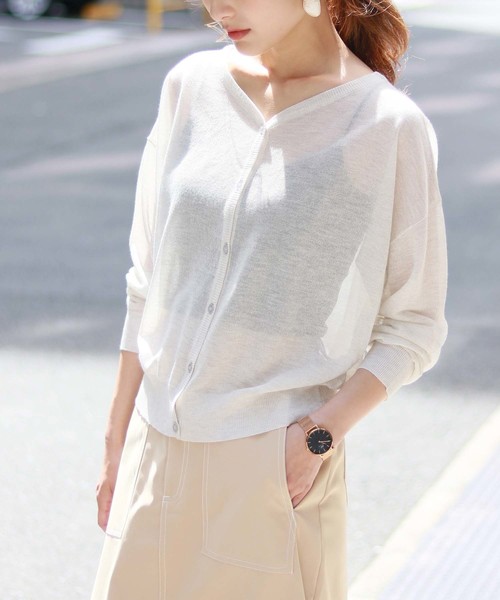 『なんだか肌寒い』におしゃれに活躍してくれる2wayカーディガン シャリ感のある薄手の生地を使用し、光が当たるとラメが上品に輝きます。 ボタンを前にしてデコルテをすっきり見せてくれるVネック、 後ろにまわして着れば抜け感のある後ろ姿に。 ちょっとした羽織が欲しくなるこれからの時期、飽きずに着まわせる優秀アイテムです◎ 【サイズ:M】 着丈:49cm 身幅:62cm 肩幅:58cm 袖丈:43cm 着用モデル:160cm ※撮影場所により、実際の色味と若干異なる場合がございます。 あらかじめご了承くださいませ。