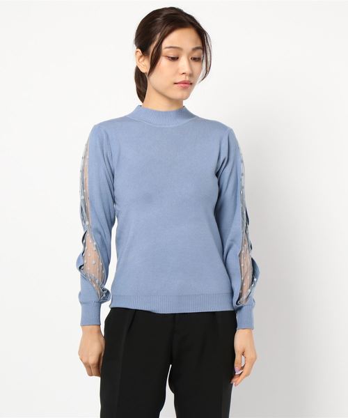 サイドスリーブにあしらわれたドットチュールレースが目を引くアイテム。一枚着るだけで女度がアップする優秀デザイン◎。【素材・サイズ感】プチハイネックで小顔効果が狙えるのが嬉しいポイント。肌触りの良いハイゲージニットでごわつかず、スタイリングもしやすいアイテムです。