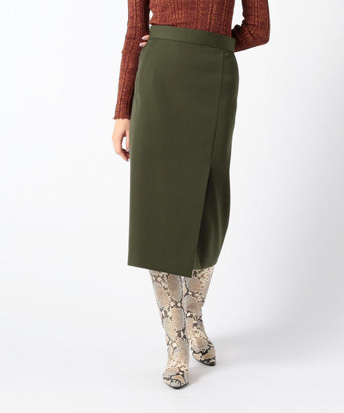 さらりとしたタッチとさりげない光沢感が特徴のポリエステルウールの二重織り素材を使用したスカート。裾に向かってすとんと落ちるIラインシルエットに膝下までのミディ丈でクラシカルなバランスに仕上げました。ミニマルなデザインにラップ風のスリットで上品かつアシンメトリーなポイントをプラス。ニットやカットソーをタックインしてカジュアルにもブラウスと合わせてフェミニンにも、着こなし次第でオンオフ問わず幅広く活躍してくれます。2019AW商品店舗にお問い合わせの際は、下記の品番をお申し付けください。品番:11059505703