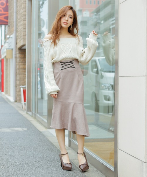 表情豊かなアシメントリーなヘムラインが魅力的な、マーメイドスカート。 ウエストのレースアップしたスピンドルが、メリハリ付けしてくれます◎ 存在感がありながらも、品良く着こなせる1枚はオンオフ問わずに幅広く着回せるのも魅力的!