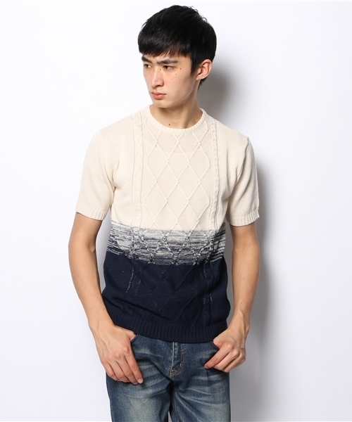 長袖で人気だったグラデーションニットを半袖にし、今期の夏のトレンドでもあるニットTシャツ。 カラーもマリンな雰囲気が強すぎない色でさわやかに仕上げています。 model H185 B87 W70 H89 着用サイズ:LARGE