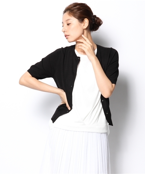 ハイツイストのコットンを使用しているので、肌触りが涼しいニットになります。 ちびカーディガンですが、少し長めの半袖なので、ノースリーブに羽織ったり、肩掛けにも便利です。 万能なモノトーンカラーと白に映えるブルーを用意しました。 店舗にてお問い合わせの際は、下記の品番をお申し付け下さい。 【A0148KCD001】