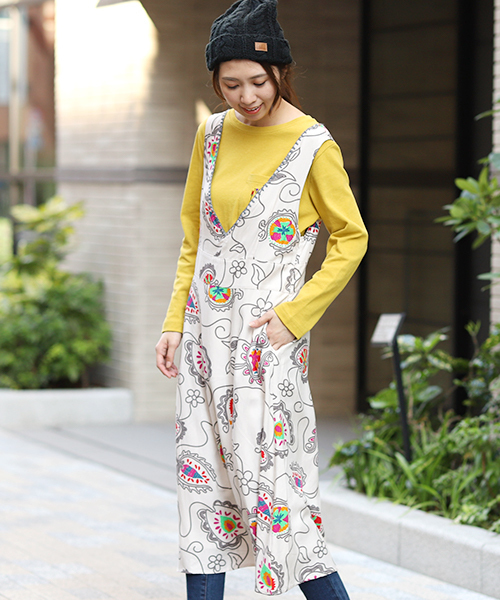 カラフルなガーランドをモチーフとした柄でヒッピームードが盛り上がるプリントワンピース。ベーシックなロンTと合わせて着られるサロペットスカートタイプです☆ ネックラインに刺繍をあしらい、レーヨンのとろんとした生地が着心地抜群♪ざっくりとしたVネックとほどよい丈感が、バランスのいいスタイルに導いてくれます☆ サイズはレディースフリーサイズで、カラーはアイボリーとネイビーの2色をご用意しました。 【お買いものをお楽しみいただく為に!】 ▼商品のお気に入り登録 完売カラーの再入荷通知や、ラスト1点の通知、セールの通知も受け取ることができます。 ▼ブランドのお気に入り登録 新商品や再入荷など、いち早くブランドのお得な情報を受け取ることができます!
