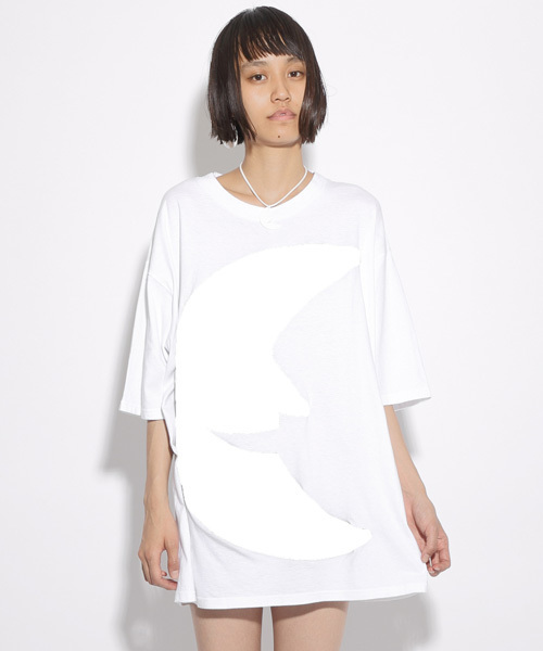 月のモチーフを大胆にデザインしたTシャツ。ゆとりのあるシルエットで抜け感のあるスタイルに仕上がります。レギンスやスキニーパンツをさらりと合わせてミニワンピ感覚で着るのもお勧めです。