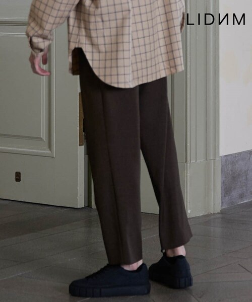 定評のあるLIDNMのパンツシリーズから新たなシルエットの登場。 2タックで腰まわりにゆとりを入れて裾にかけてほどよくテーパードし、丈感は短めのアンクル丈に設定し足下がすっきり見えます。 またウェストの内側にはドローコードをつけているのでベルトいらずウェストの調整ができます。 ジャケットと合わせた時に、トタールで絶妙に抜け感のあるIラインになるようなシルエット設計にしているので、是非、セットアップで着て頂きたいアイテムです。勿論、パンツ単品でも絶妙なシルエットなので色々なアイテムに合わせられます。