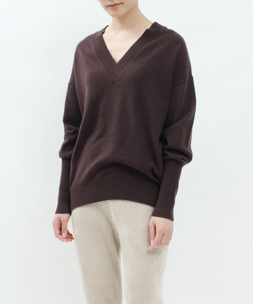 SOI-MeME 上質な肌触りが心地よいカシミヤ100%のトップス。 ベビーカシミヤは生後12カ月までの子ヤギのやわらかい毛のみ使用した優しい風合いが特徴で希少な素材。 従来のカシミヤよりも柔らかく、保温性があります。 ネックラインが美しく見える深めのVネックと、パンツスタイルにも合わせやすい後ろが少し長めの丈感。 一枚ではもちろん、Tシャツをインした着こなしなど、 とっておきのベーシックアイテムとして、自由なスタイリングをお楽しみください。