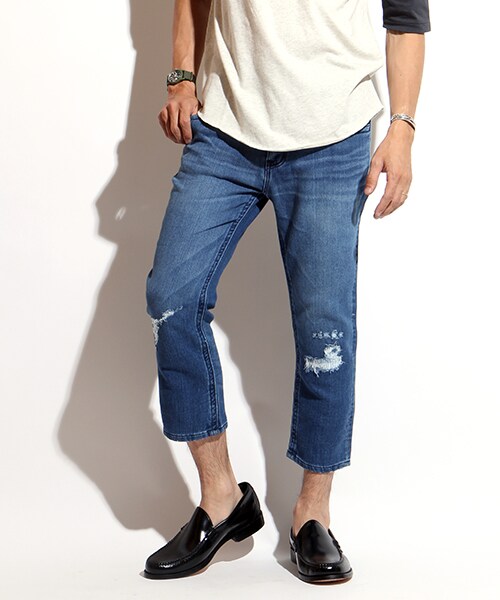 適度な伸縮性と履き心地の良さを追求したスキニー型ニットデニム。インディゴニットカットの糸を布帛の編機で織る事で、デニムだけど、ニットカットのように生地が伸縮性あり履きやすい生地が特徴のニットデニムです。ブルーカラーは両膝あたりにクラッシュ加工を施し、ネイビーカラーは濃紺でスタンダードタイプになります。モデル体型のM着用で、シルエットはややテーパードシルエットでスキニーのため、ボディラインに沿った形ですが、伸縮性のある素材の為、快適な穿き心地です。