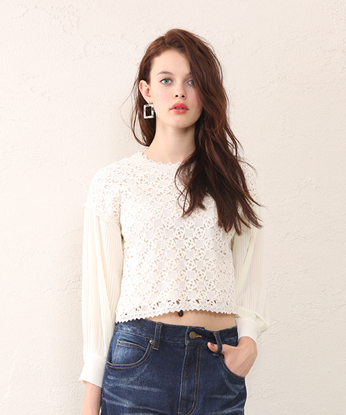 Omekashi Omekashi定番のレース×シフォンブラウスです。肩落ちデザインとボリュームのある袖がポイントです!デニムスタイルにお勧め。