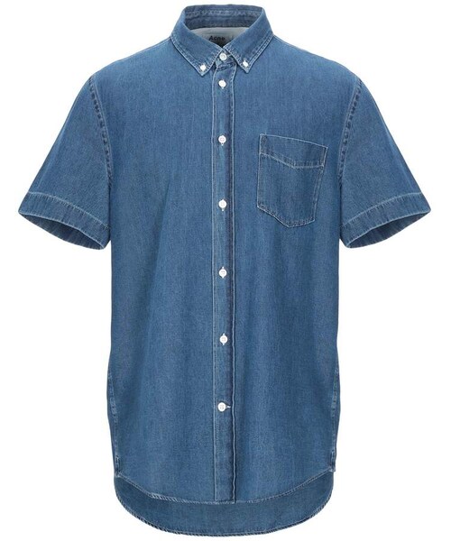 ACNE STUDIOS Denim shirts. denim, no appliqués, basic solid color, dark wash, short sleeves, button-down collar, single-breasted, front closure, button closing, single pocket. 100% Cotton, Viscose