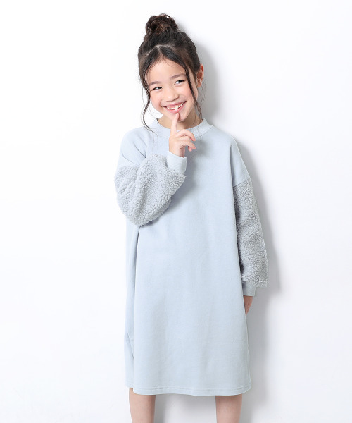 ボア袖の切り替えがポイント、『袖ボアワンピース』ボアの切り替え袖や、身幅ゆったりのビッグシルエットなどトレンド感が凝縮のワンピース。旬カラー5色をラインナップ、女の子の可愛さを引き出してくれる一着です。キッズからジュニアまでをカバーする100cm~160cmまでの豊富なサイズ展開になっています。■素材■やわらかく厚みのある裏毛素材太い番手の糸を使用し厚みのある裏毛スウェット。また糸を甘くよることでふんわりやわらかな肌触りに仕上げました。また綿100%なので、肌触り・通気性の良いさらっとした着心地で汗の吸収・発散性に優れており型崩れしにくいのもポイント。■ディティール■・両サイドにポケット付き・裏側にお名前タグ付き・袖部分は着脱がスムーズになるようにボアを使用しておりません