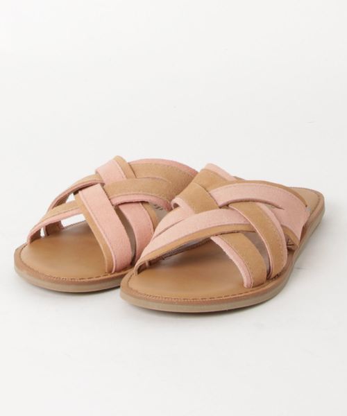 カジュアルでクールなスライドサンダルにツートンの十字模様のスウェードディテールで、遊び心いっぱいのカラーや素材を取り入れた。