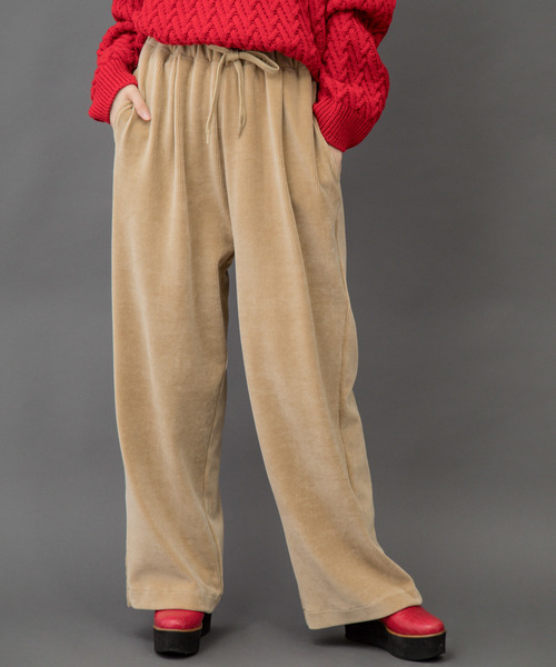 ◆しなやかさととろみが病みつきになる。ベロアのような風合いのジャージコーデュロイ素材のリラックスイージパンツ◆<MATERIAL>見た目はまるでコーデュロイのような仕上がりのパイルジャージの素材です。起毛しやすいコットンパイルを使用してベロアのようなタッチの柔らかさと光沢が特徴です。ポリウレタンも混紡しているので、布帛のコーデュロイにはない伸びが驚くほどの着心地の良さと、柔らかさ、そして温かみが表現できる素材感が最大のポイントになっています。<DESIGN>ジャージ素材なので布帛にはない柔らかい風合いが特徴で、分量感タップリのリラックスワイドパンツに仕上げました。ドレープ性に優れた素材なのでキレイに落ち感が出るのでワイドパンツでも太みえしない縦ラインが出ます。ウエストはゴムと紐の仕様なのでストレスなく着用できます。同素材のMN192U48(コーデュロイジャージー タートルネックワイドプルオーバー)のタートルプルオーバーとセットアップ可能です。<COLOR>■アイボリー:優しい印象のバニラカラー。素材の雰囲気を一番出せている上品でカジュアルなこなしをランクアンプさせることが出来るカラーです。■ダークグレー:深みのあるモード系のグレーカラー。陰影が付きやすくグッとしまった印象になるグレーカラー。シャープな印象が引き立ちます。■ベージュ:やや明るめのミルクティーのようなクリーミーなベージュカラー。カジュアルな印象と女性らしい優しい印象が合わさった使い勝手の良いカラーです。■ダークオレンジ:朱赤からオレンジに近い暖色系のカラー。陰影も拾いやすく深みのあるカラーになります。他にはないカラーで黒などにも合わせやすいカラーです。*お取扱いについては、商品についております品質表示にてご確認ください。洗濯:洗濯機使用可.............................≪INFORMATION ≫............................▼商品のお気に入り登録▼『♡』マークを押してお気に入り登録して頂いた商品は、セール開催の通知やクーポン発行などのキャンペーンなど、お得な情報をいち早く受けとる事が出来ますので、ぜひご登録ください。